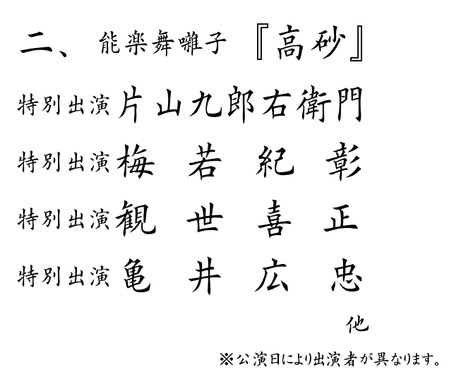 能の代表的な祝言曲です。前半では、老夫婦に姿を変えた松の精が、松は不変の象徴である、とそのめでたさを説き、後半では神が現れ、平和な世を寿ぎ舞を披露します。雌雄の松が寄り添う「相生の松」にことよせ、婚礼でも謡われる縁起の良い作品です。