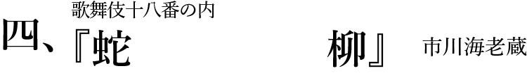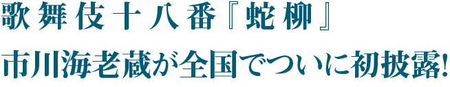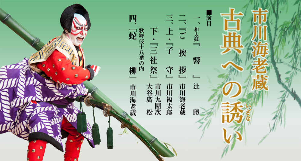 今年で7年目に突入した「古典への誘い」。様々な演目をご覧いただく中、やはり全国の皆様に成田屋の〝歌舞伎十八番〟をご披露したいという想いが募り、今回の公演で実現した。十八番の中で選んだのは、上演が途絶えていた演目を海老蔵が、第一回市川海老蔵自主公演「ABKAI」で復活させ大きな話題となった『蛇柳』。歌舞伎特有の「押戻」という手法を用い、海老蔵が三役を相勤める。古風な中にも新しい感覚を取り入れた舞踊劇にご期待いただきたい。