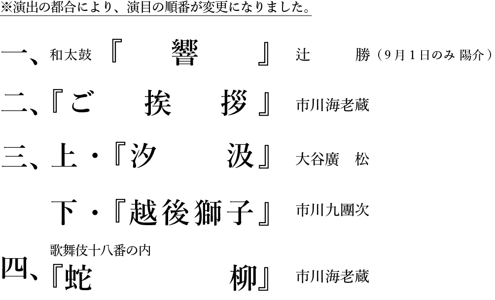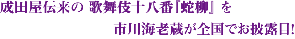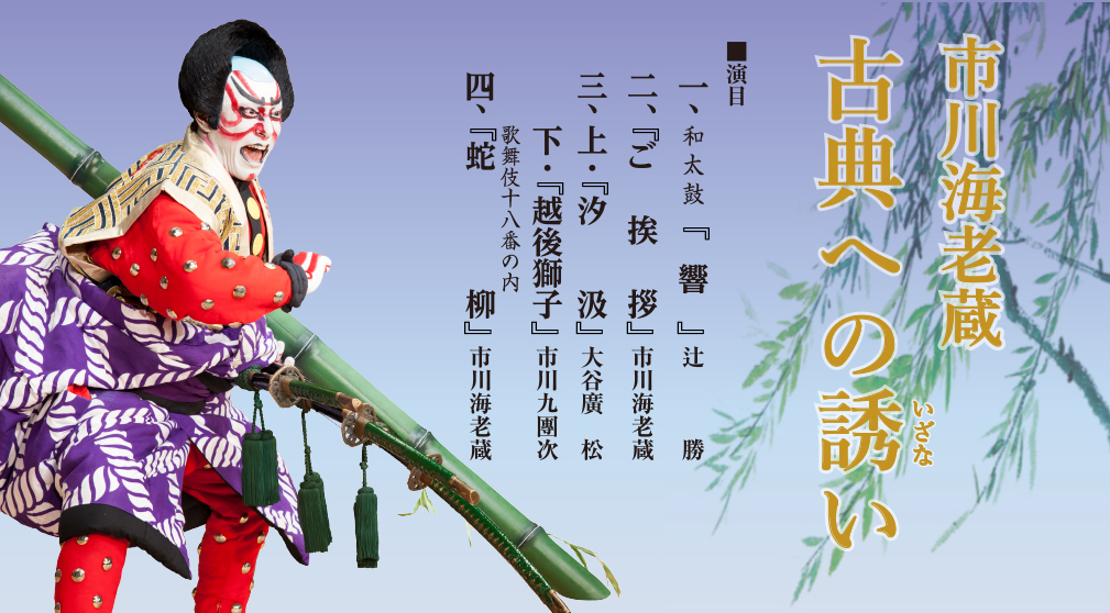 今年で6年目に突入した「古典への誘い」。様々な演目をご覧いただく中、やはり全国の皆様に成田屋の〝歌舞伎十八番〟をご披露したいという想いが募り、今回の公演で実現した。十八番の中で選んだのは、上演が途絶えていた演目を海老蔵が、第一回市川海老蔵自主公演「ABKAI」で復活させ大きな話題となった『蛇柳』。歌舞伎特有の「押戻」という手法を用い、海老蔵が三役を相勤める。古風な中にも新しい感覚を取り入れた舞踊劇にご期待いただきたい。